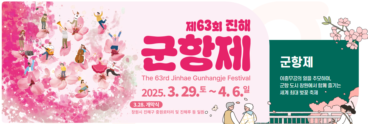 진해 군항제는 대한민국에서 가장 유명한 벚꽃 축제로, 매년 4월 초 경상남도 창원시 진해구에서 열립니다. 진해구 전역이 벚꽃으로 뒤덮여 장관을 이루며, 전국에서 300만 명 이상의 방문객이 찾는 대규모 행사입니다. 특히 이 축제는 한국 해군의 역사와 함께하며, 다양한 문화 공연과 퍼레이드도 함께 진행됩니다.